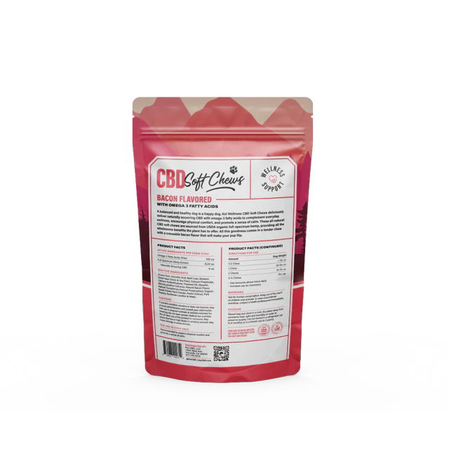 Give your dog the daily wellness boost they deserve with Koi Omega Hemp CBD Soft Chews. Each chew combines 6 mg of full-spectrum CBD with nourishing omega-3, 6, and 9 fatty acids, promoting skin health, immune balance, and a calm mindset. With a savory Bacon flavor, these veterinarian-formulated, grain-free treats make wellness a delicious daily ritual.